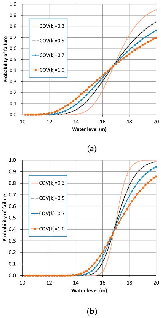 Figure 9 displays the estimated mean, standard deviation, and COV values of the seepage rate with respect to the water level. The mean and standard deviation values estimated through the MCS were consistent with those obtained from the fitted lognormal distribution. As shown in Figure 9a,b, the mean and standard deviation of the seepage rate increased proportionally with the water level. The COV depicted in Figure 9c also remained constant, irrespective of the water level, but exhibited a smaller value compared to the COV of the exit hydraulic gradient. The allowable seepage rate is not clearly defined, as it depends on the purpose of water storage and the condition of the structure. However, failure may occur if the seepage rate exceeds a certain limit. An excessive seepage rate hinders the retention of available water, which reduces the benefits of constructing water-retaining structures. Therefore, the allowable seepage rate is prescribed and managed in terms of storage efficiency.