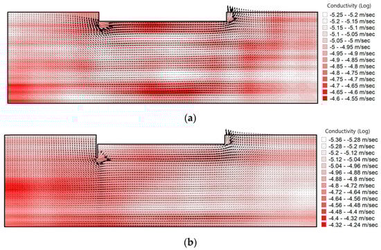 Figure 14 illustrates the results of estimating the mean and standard deviation of the seepage rate, exit hydraulic gradient, and uplift force by performing MCS while changing the . The figure shows that the has a limited effect on the mean values, but the standard deviation is somewhat affected. Both the mean and standard deviation of the exit hydraulic gradient, seepage rate, and uplift force vary linearly with the water level.