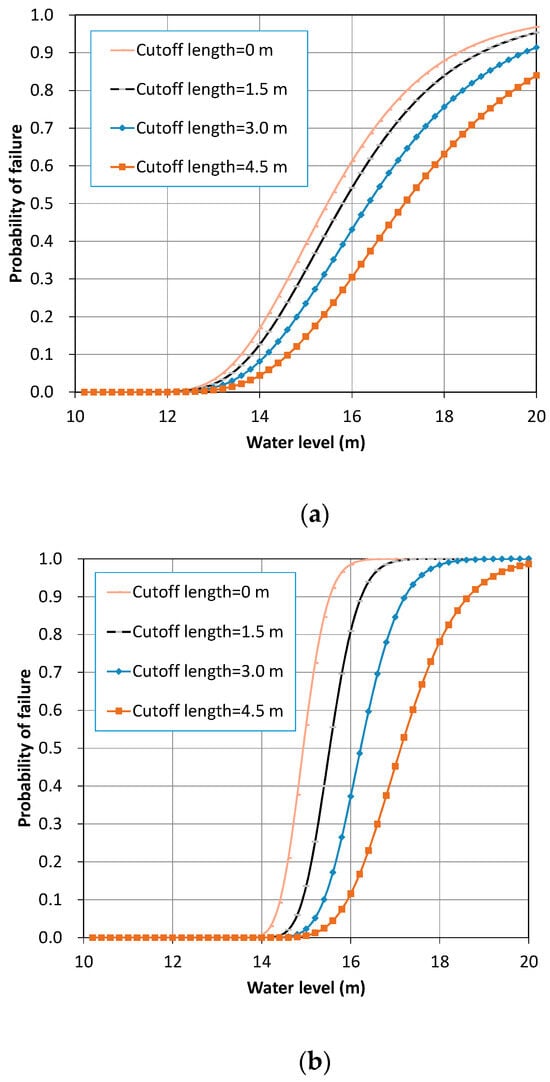 In this section, the effect of variation in cutoff length on the fragility curve was examined for the basic condition while other conditions were fixed. The proposed Method A was applied to efficiently build fragility curves with minimal computation. Monte Carlo simulations were conducted for different cutoff lengths, considering two water levels: and . Subsequently, the mean and standard deviation of the exit gradient, uplift force, and seepage rate were estimated. As anticipated, increasing the length of the cutoff resulted in a significant reduction in the mean values of the exit gradient, uplift force, and seepage rate. However, no significant variations were observed in the standard deviation of the exit gradient, uplift force, and seepage rate.