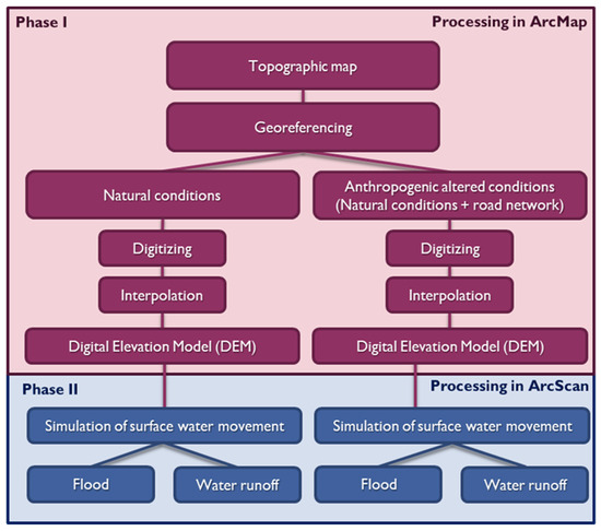 Phase II includes a spatial analysis and simulation of surface water movement (Figure 3). The simulation of the surface water level changing within the SNR “Obedska bara” was done in the ArcGIS program in the ArcScene application. In the simulation, both digital models of the terrain were used (simulations of the surface water movement and changes in the water level of the Sava River in the area of the SNR “Obedska bara” with and without the influence of the road network on the water regime). Different levels of flood waters are defined as individual layers, and surface water level oscillations are shown by overlaying the layers of water surfaces and the digital terrain model. The surface (flood) water movement depends mostly on the difference in altitude. Since in this case, it was about a specific mosaic of oscillations of height differences, special attention was paid to simulations of the water movement on the surface of the terrain. A logical overlapping of water surface sections and terrain models was carried out by observing the law of water movement in natural conditions.