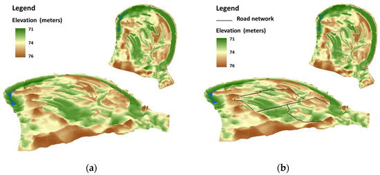Digital terrain model of the researched area: (a) Natural conditions; (b) Anthropogenically altered conditions.