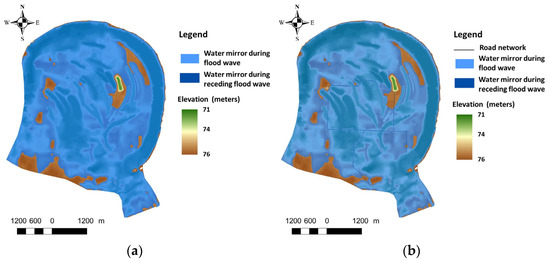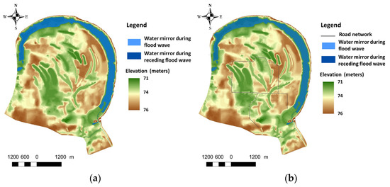 Conditions altered by human factors: Road network construction in the investigated area affects the site conditions, i.e., the basic relief structure has been changed. The changes caused by human factors (roads and canals) have been shown in the new terrain model. A simulation of the surface water movement which takes into account human factors is displayed in Figure 5b, Figure 6b, Figure 7b and Figure 8b. Surface water flows into the SNR “Obedska bara” through the Vok canal; the water first flows into the eastern part of the “horseshoe” arch up to an elevation of 73 m above sea level, where the water is retained in the surrounding lower grounds. Due to the rising of the water level in the Sava riverbed to an elevation of 73 m above sea level (Figure 5b), there is no difference in the surface water movement in this area compared to natural conditions. The impact of the relief change due to the construction of a road on the movement of flood waters is significant at an altitude of 74 m above sea level (Figure 6b). The water is retained on one side of the road until it reaches above the road level, i.e., 74.2 m above sea level, and does not overflow to the other side to fill the lower terrains (depressions) on that side. This water movement occurs only while the water level is above the elevation of the road level.