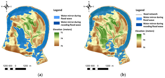Water area during a flood wave in the research area at a water level in the Sava River of 75 m above sea level: (a) Natural conditions; (b) Anthropogenically altered conditions.