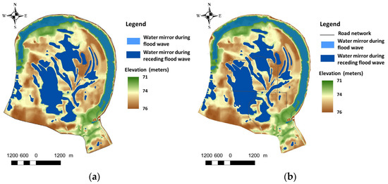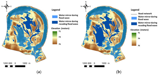 Water area that remains after a flood wave in the research area at a water level in the Sava River of 74 m above sea level: (a) Natural conditions; (b) Anthropogenically altered conditions.