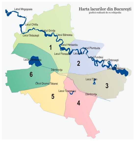 - Lista Lacurilor din București—Wikipedia. Available online: https://ro.wikipedia.org/wiki/Lista_lacurilor_din_Bucure%C8%99ti (accessed on 3 September 2023).