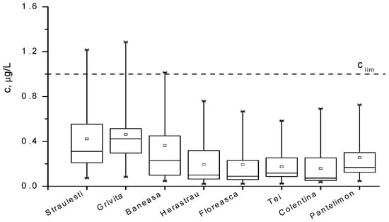 The concentrations of Pb2+ ions within the analyzed waters are presented and compared in the box diagrams in Figure 3 and Figure 4 and quantified in Table 4. One can remark that the lead pollution is not a serious problem in most of the waters around Bucharest, except for the lakes numbered with 1, 2, 3, and 12 in the Table 1, where the concentrations are accidentally above 1 µg/L. The content of pollutants in the water of the Colentina River is rather high upstream of the entrance to Bucharest, and it is diminished via natural dilution in the surroundings lakes denoted with 4, 5, 6, 7, and 9. As expected, the lakes inside parks, such as 8, 10, and 11, present a smaller content of lead, while lakes 1, 2, and 12 are the most polluted. The distribution of Pb2+ concentration in all cases is not symmetrical, suggesting that this concentration shows a periodic character.