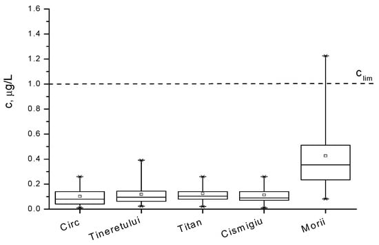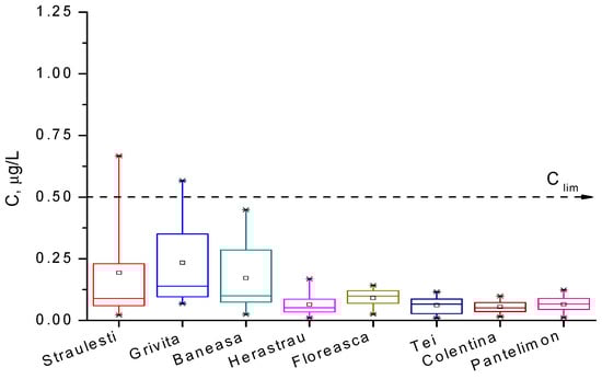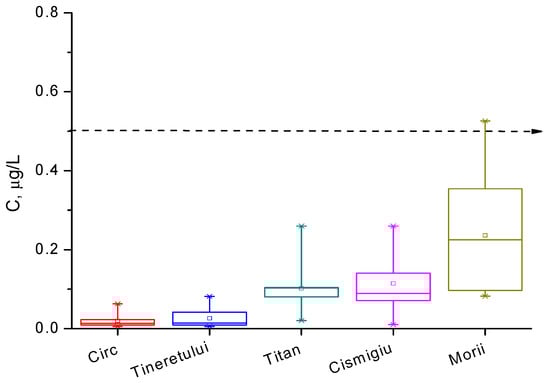 For the analyzed water samples, the concentrations of Hg2+ ions are presented in box diagrams in Figure 9 and Figure 10, comparatively, and they are quantified in Table 5. We observe that mercury ion pollution is not a serious problem in most waters around Bucharest, except for the Străuleşti and Griviţa Lakes, where the concentrations are accidentally above 0.5 µg/L. The content of the pollutant in the water of the Colentina River is rather high upstream of the entrance to Bucharest, and it is diminished in the surrounding lakes via natural dilution. Lakes inside parks, such as Cişmigiu, Circului, Titan, and Tineretului, exhibit a lower metal content, as expected, while Morii Lake is among the most polluted surface waters in the Bucharest zone. The distribution of the concentration of Hg2+ ions is, in all cases, asymmetrical, suggesting that the time evolution of this indicator presents a periodic character. These findings lead to the conclusion that in the Bucharest territory, the main source of pollution with Hg2+ is represented by particulate matter from air that is deposited on the surfaces of lakes. The principal sources of PM in air are the gases emitted from fossil fuels combustion in thermal or electrical power plants and vehicles. The numerous demolitions and rehabilitations of old buildings produce a huge source of dust with heavy metal content; these are another important source of mercury pollution. Unfortunately, the wastes from these works are chaotically disposed near or into lake water, causing them a significant degradation. Also, the rainfall over agriculture lands treated with organomercury compounds provides other pollution causes in the areas of the Străulesţi and Griviţa Lakes.