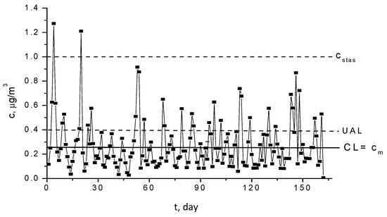 Figure 11 shows the result of a statistical analysis for the experimental data sampled from Griviţa Lake, which is one of the most polluted surface waters in Bucharest, where the Shewhard monitoring diagram is illustrated. The central line of the diagram (CL) is the mean of the values measured, and the upper attention limit (UAL) has been computed with the rule 3σ. The diagram highlights that UAL is higher than the limit concentration and this implies that the process is out of statistical control, as is proven also via the value of process capability index, , defined using [,]