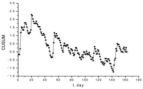 The CUSUM diagram in Figure 6, for the data analyzed in Figure 5, proves that the general trend of data is decreasing, and it oscillates periodically. Consequently, the trend of data is calculated, and this is represented in Figure 7. As one may observe, the data have an insignificant decreasing trend, demonstrating that the target value within the CUSUM diagram has been not correctly established.