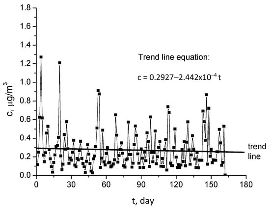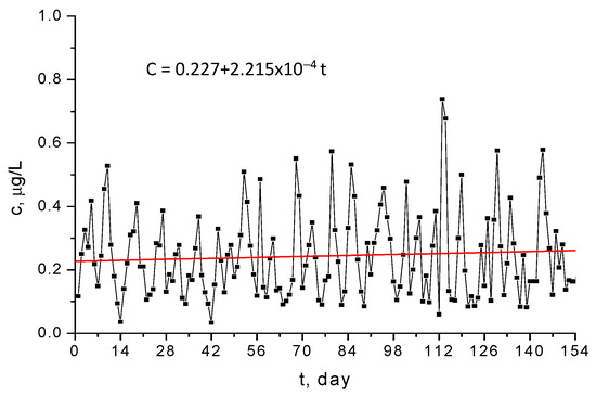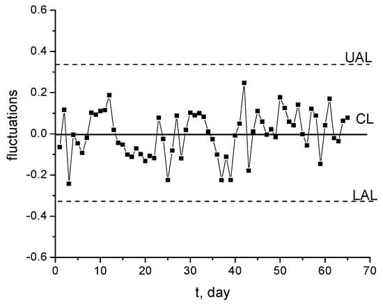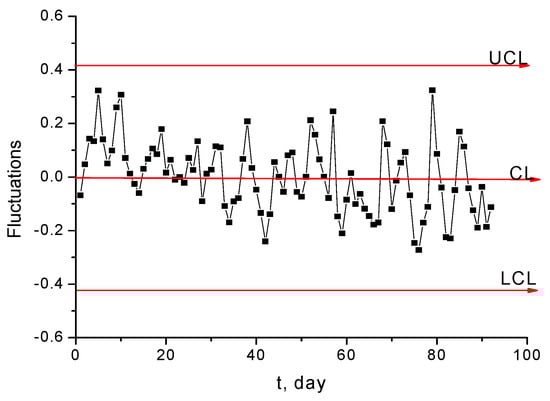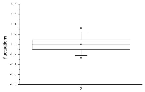 It can be demonstrated that the Hg2+ monitored concentrations form a nonstationary time series, since they exhibit an increasing trend and periodicity [,], as illustrated in Figure 12 and Figure 13. If the trend and the periodicity are removed from the initial data, a novel time series based on fluctuations only is formed [,]. The box diagram from Figure 14 reveals that fluctuations have a symmetrical distribution for which the median and mean values are the same []. As a result, the fluctuation distribution can be approximated with a normal distribution.