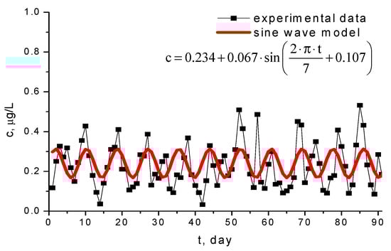 The periodic character illustrated by the oscillating trend shown in Figure 6 is proven using the correlation of data with sine wave model, presented in Figure 8. The equation of this model, obtained via nonlinear regression, has the form: