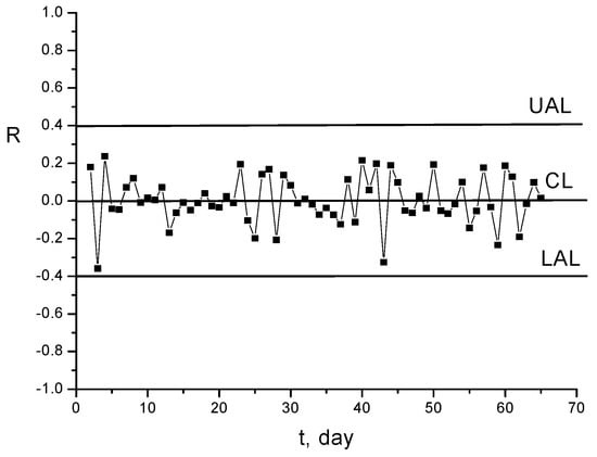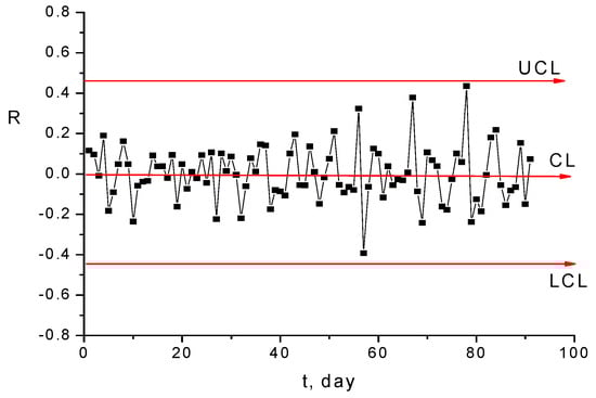 The X and R diagrams in Figure 15 and Figure 16 prove that, from the fluctuation point of view, the monitored process is under statistical control [].