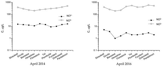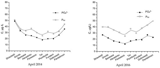 The data represented in Figure 17 and Figure 18 present the concentration variations for monitored pollutants within the considered lakes around Bucharest in April 2014 and 2016, respectively. Although these data show some variations from one lake to another, statistical tests have proven that these differences are insignificant. However, in all the presented cases, the first lake (Străuleşti) and last lake (Pantelimon) have higher concentrations of nitrates and phosphates due to nutrients used in the agricultural activity in those zones.