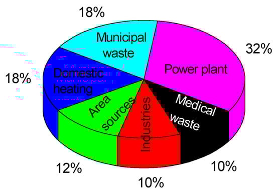 From the pie diagram shown in Figure 25, the main pollution source with mercury of the atmosphere, and implicitly of surface water and soil, is represented by gases released from fuel combustion in thermal power plants and building heating, as can be seen.
