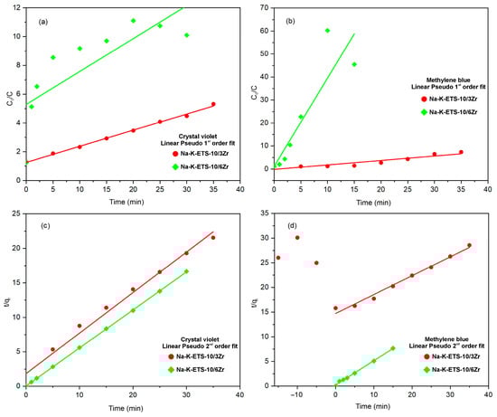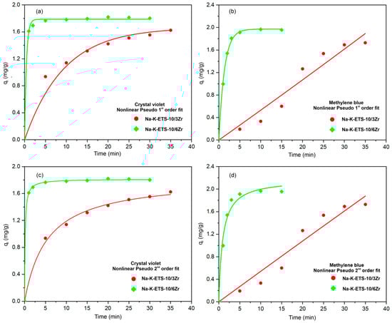 | Na-K-ETS-10/6Zr | qt = 5.9701 k1 = 0.0743 R2 = 0.9971 | qt = 1.8150 k2 = 4.1875 R2 = 0.9998 | qt = 7.1800 k1 = 0.0497 R2 = 0.9986 | qt = 2.1794 k2 = 0.5020 R2 = 0.9822 |