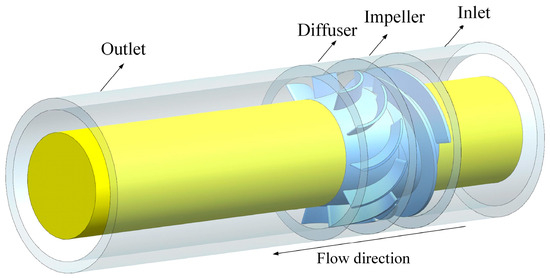 Bladegen 18.1 software is used to model the impeller domain and the diffuser domain. In order to ensure the stability of the flow in the multiphase pump, the upstream and downstream are extended to a certain extent, which ensures the accuracy of the numerical simulation, and the multiphase pump model is shown in Figure 1.