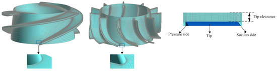 In this paper, the four parts of the inlet extension section, impeller, diffuser, and outlet extension section of the computational domain are divided by a hexahedral structured mesh, while the O topology is used to control the boundary layer around the blade, and the mesh in the tip clearance is encrypted; the specific mesh is shown in Figure 2.