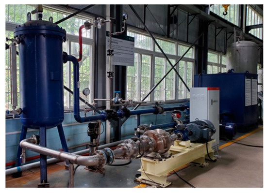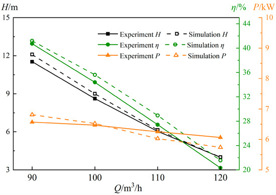 To verify the accuracy of the numerical simulation results, a multiphase pump experimental platform was built independently, as shown in Figure 3. Figure 4 shows the experimental system diagram of the multiphase pump, which was mainly composed of four parts: a gas delivery system, a liquid delivery system, a gas–liquid mixing system, and a multiphase pump test system. To visualize the multiphase pump pressurization unit for the test, the shell material used was plexiglass. To ensure the accuracy and reliability of the numerical simulation, the multiphase pump with the impeller tip clearance of 1.0 mm was tested for external characteristics at a rotational speed of 3000 rpm under pure water conditions (flow of 60–120 m3/h) and gas–liquid two-phase condition (GVF = 5%), while the experimental results were summarized with the numerical simulation results and the external characteristic curve was drawn, as shown in Figure 5 and Figure 6. Figure simulation and tests of the head and efficiency were performed, and the output power error was less than 5%, which is unavoidable, so this verifies that the numerical simulation calculation method selected in this paper is reliable.