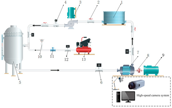 Experimental system diagram of multiphase pump. 1—Water tank; 2—regulation valve; 3—booster pump; 4—flowmeter; 5—gas–liquid mixing tank; 6—pressure transducer; 7—multiphase pump; 8—torquemeter; 9—motor; 10—gas flowmeter; 11—regulation valve; 12—barometer; 13—air compressor.