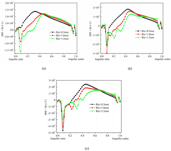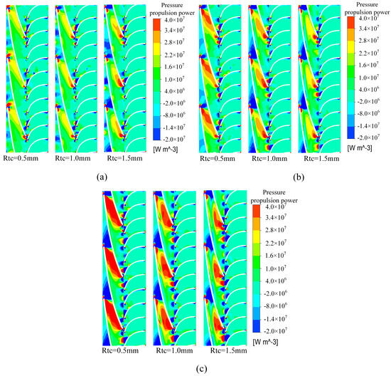 (1) At different flows, the pressure propulsion power near the impeller inlet decreases sharply, and the pressure propulsion power is mainly located in the first half of the impeller near the suction surface of the blades, while the pressure propulsion power performance improves with the reduction in the impeller tip clearance. With the increase in flow, the pressure propulsion power in the pressurization unit gradually increases, and its energy loss also increases.
