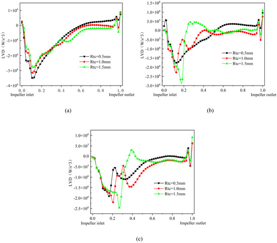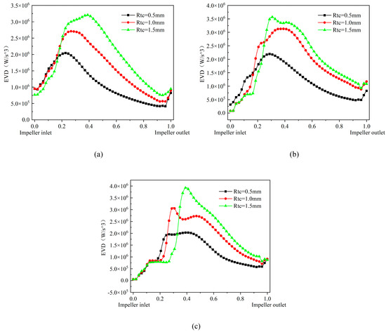 Figure 11 reflects the effect of different flows on the vortex enstrophy dissipation of the multiphase pump. As can be seen from Figure 10, under the condition of 0.8Q flow, the variation rule of vortex enstrophy dissipation is basically similar under different impeller tip clearances, and with the increase in impeller tip clearance, the vortex enstrophy dissipation is also obviously strengthened. At 1.0Q flow, the vortex enstrophy dissipation in the first half of the impeller is more turbulent, the trend of the second half of the impeller is similar to the 0.8Q flow, and the vortex enstrophy dissipation value is greater than the 0.8Q flow. In the 1.2Q flow conditions, the direct collision between the leading edge of the blade and the fluid caused a large amount of energy loss, so the impeller inlet vortex enstrophy dissipation is more chaotic, the trend of the second half of the impeller is similar to the first two flow conditions, and the peak value of the vortex enstrophy dissipation is not very different from the 1.0Q flow conditions. In general, as the flow increases, the vortex enstrophy dissipation in the impeller pressurization unit increases accordingly, and the vortex enstrophy dissipation in the first half of the impeller is more chaotic.