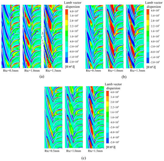 0.8Q (a), 1.0Q (b), 1.2Q (c). Distribution of Lamb vector dispersion in impeller with different flow conditions.