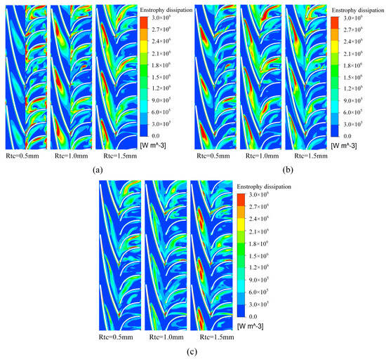 0.8Q (a), 1.0Q (b), 1.2Q (c). Distribution of the vortex enstrophy dissipation in the impeller with different flow conditions.