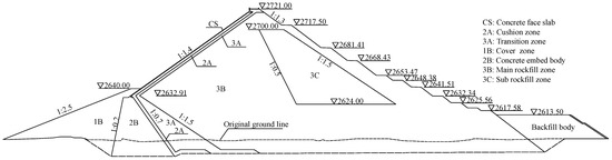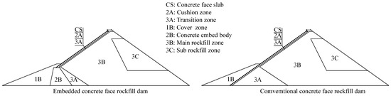 - The ECFRD at the hydropower station was technically feasible and could effectively improve the static stress–strain characteristics of the dam body while shortening the length of the concrete-face slab and the joint. Under earthquake conditions, local reinforcement and other reinforcement measures could be applied to adapt the ECFRD to a 200–300 m high dam. For related projects, considering the project cost and stability of the embedded concrete body, we recommend that the height of the embedded concrete body should be 60 m, which is 0.4 times the height of the dam in this study.