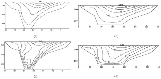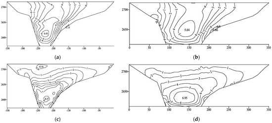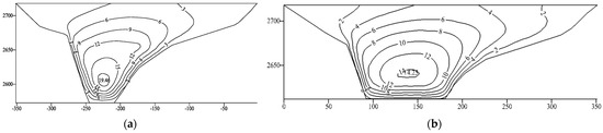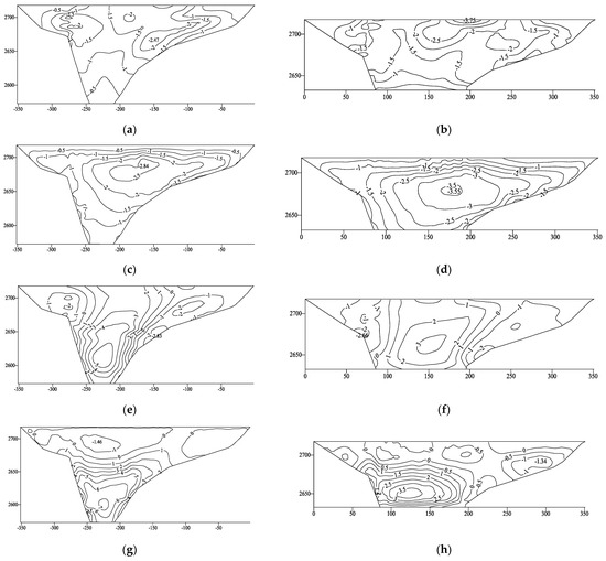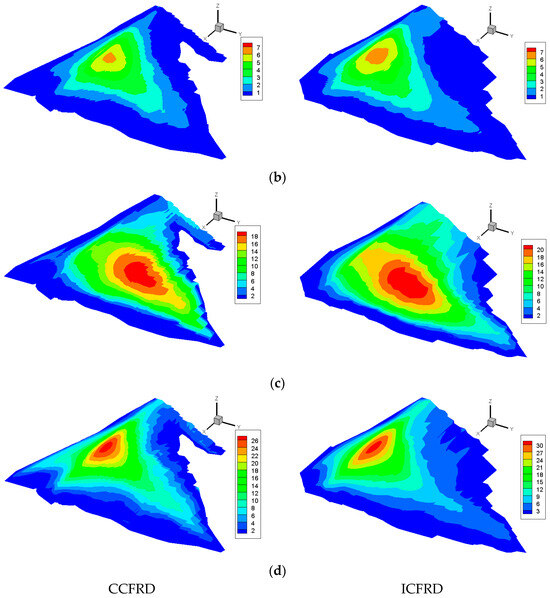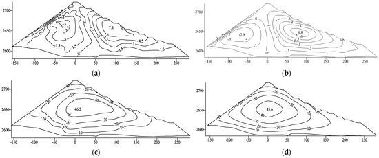 - Under the actions of dynamic and static–dynamic superposition, the deformation of the rockfill and concrete-face slab increased slightly, whereas the tensile stress on the concrete-face slab decreased slightly after setting the concrete-face slab. The permanent seismic subsidence of the rockfill body accounted for approximately 0.2% of the maximum dam height, the ratio of the maximum dynamic value to the maximum static value of the concrete-face slab increased from 1.7 to 2.9, and the cumulative static and dynamic value of the deflection of the concrete-face slab reached 35.72 m. Overall, the dynamic results for the ECFRD were within the controllable range of a 150 m concrete-face rockfill dam.