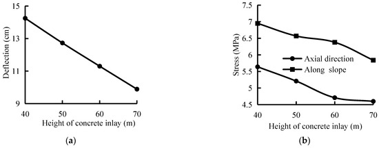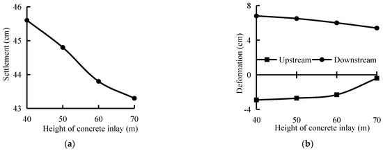 - Compared with a CCFRD, an embedded concrete body under a static load inhibited the static displacement of the rockfill along the river. When the height of the embedded concrete body was 40 m, the maximum horizontal displacements of the upstream and downstream rockfill were 2.1 and 0.6 cm less than those of the CCFRD, respectively. Moreover, owing to the stress on the embedded concrete body, the tensile stress along the slope of the concrete-face slab was completely eliminated, the axial stress was greatly reduced, the maximum deflection of the concrete-face slab decreased by 5.21 cm, and the area experiencing maximum stress shifted to 0.47 times the dam height.