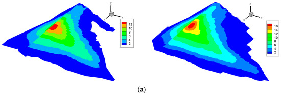 The results of the dynamic and static–dynamic superposition of the concrete-face slab under earthquake conditions are shown in Figure 13 and Figure 14, respectively, and Table 6. The results indicate that the tensile stress on the concrete-face slab was the main cause of its cracking. Consequently, we focused only on the distribution law and superposition state of the dynamic tensile stress under earthquake conditions. Figure 13 and Table 6 indicate that the maximum deflection of the concrete-face slab in the CCFRD caused by the earthquake was 29.85 cm, yielding a maximum deflection of 33.54 m after accumulating deformation during normal operations. For the ECFRD, the maximum deflection of the concrete-face slab increased to 31.21 cm, yielding a maximum deflection of 35.72 m after accumulating deformation during normal operations.