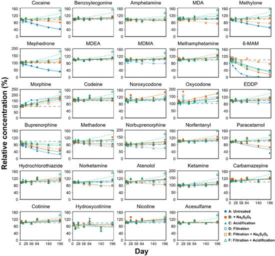 Amphetamine-type drugs, including methamphetamine, amphetamine, 3,4-methylenedioxy-amphetamine (MDA), and 3, 4-methylenedioxy-methamphetamine (MDMA) have a high stability in sewage, whether stored at room temperature for short periods, in refrigerated storage, or frozen for long periods. Ketamine and its main metabolite norketamine also have high stability under different conditions. Lin et al. evaluated the stability of different biomarkers under six different conditions—untreated, the addition of sodium metabisulfite, the addition of hydrochloric acid, filtration, and their combination at different temperatures, and some of the results are shown in Figure 2 [47].