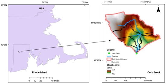 The study area is Cork Brook in Scituate, Rhode Island, USA. It is a small, forested, and pristine watershed with a 7 sq km area contributing to the Scituate Reservoir (Figure 1 and Figure 2). The Scituate Reservoir is a large reservoir serving as a drinking water source to Providence. The main land use of the study area is undeveloped forest covering 79% of the area and brushland, where 14% of land use is classified as medium-density residential []. The soil in this area is mainly coarse-loamy, mixed, mesic Typic Dystrudept [].