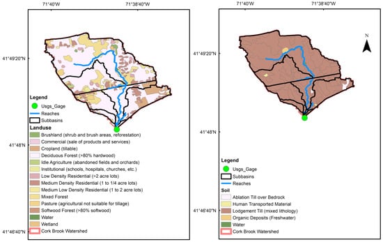 The spatio-temporal data requirements of SWAT are generally topography, soil characteristics, land cover or land use, and meteorological data. In this study land use was retrieved from 2011 statewide 10-m resolution National Land Cover Data imagery []; soil data were retrieved from a soil map from the Natural Resource Conservation Service (NRCS) Soil Survey Geographic database (SSURGO); and topographical data was retrieved from USGS 7.5-min digital elevation models (DEMs) with a 10-m resolution. These spatial data were sourced from a public database called the Rhode Island Geographic Information System (RIGIS) database. Gridded PRISM meteorological data from 2009 to 2014 was used as temporal data as the USGS gauge has flow records starting only from 2009. SWAT employs the spatial data to create subbasin and HRU units. The Cork Brook SWAT model consists of seven subbasins and 60 HRUs using land, soil, and slope thresholds of 20%, 10%, and 5%.
