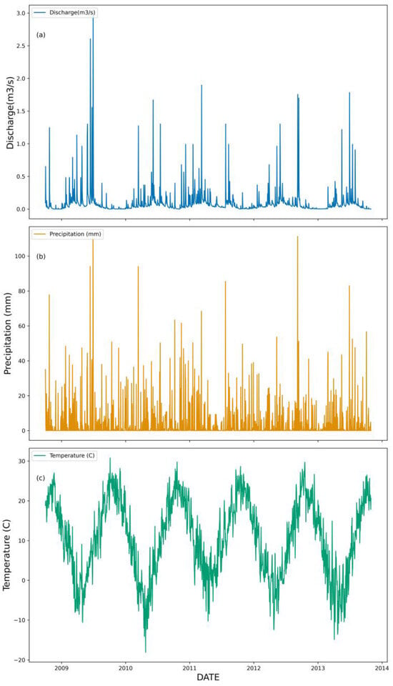 Daily Hydrometeorological data in Cork Brook, RI (a) Discharge (b) Precipitation (c) Temperature.