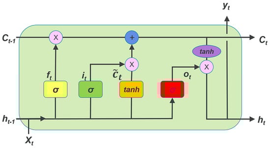 The structure of the LSTM model. The subscript “t” here represents the current time and represents the hidden state and cell state [].