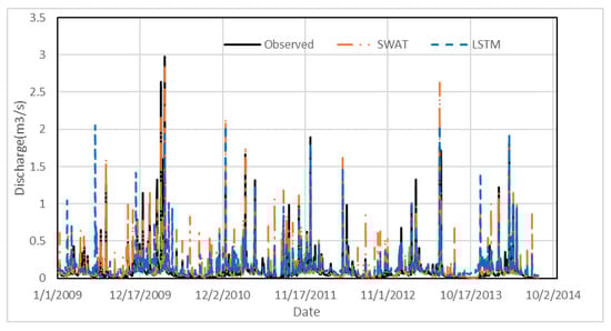 Although, modeling efforts with both conceptual and data-driven models are difficult for small watersheds, in this study, both SWAT and LSTM model results were judged satisfactorily but even though supervised calibration can be performed in SWAT, the LSTM results were comparable to SWAT results (Figure 5, Table 3). Both SWAT and LSTM results were often overestimating the low flows and some instances of high flows but did not largely overestimate peak flow as the SWAT model. The SWAT also completely misses some peaks (Figure 5) although, the physical parameters were available in SWAT with the ability to be tuned to match high flows and has been also confirmed in other studies as well [,,]. In other percentiles, both models show better agreement with the observed data.