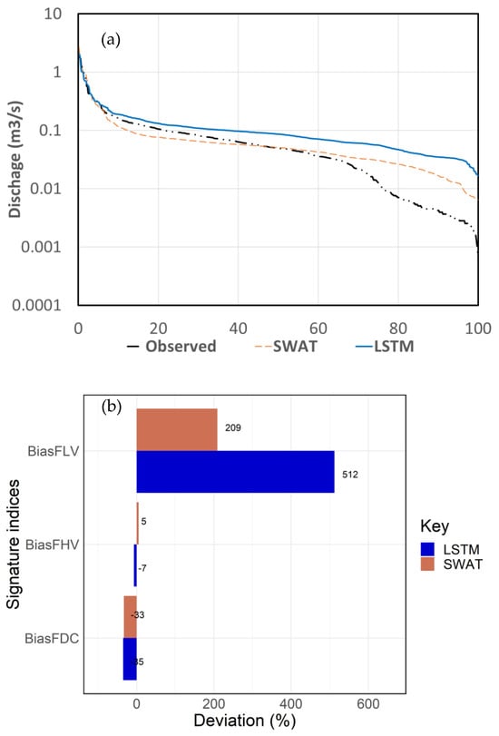 In addition to the comparison of goodness of fit, FDC and signature indices were also analyzed for a better comparison of model performance at the percentile of flows (Figure 6). From the FDC comparison at low flow areas, the difference is very apparent, but the log scale does vertical exaggeration in terms of scale. A better representation is provided by Bias FLV values. This value is positive for both SWAT and LSTM results and shows that LSTM overestimated low flows more than SWAT. As for the comparison of high flows, Bias FHV values are positive for SWAT and negative for LSTM which shows that while SWAT overestimates the peak values, LSTM underestimates it. A further look at the area under the curve till lower values of percentile from 5, 10, and 20 shows that SWAT continuously overestimates peak till 10 percentiles but starts underestimating at 20 (Table 4). In the case of LSTM, the negative discrepancy at high values continues to decrease and become positive from the 10 percentiles. The bias in low flows is very high compared to high flows and this is true for both the models. It has also been identified as LSTM’s weakness in simulating low flow.