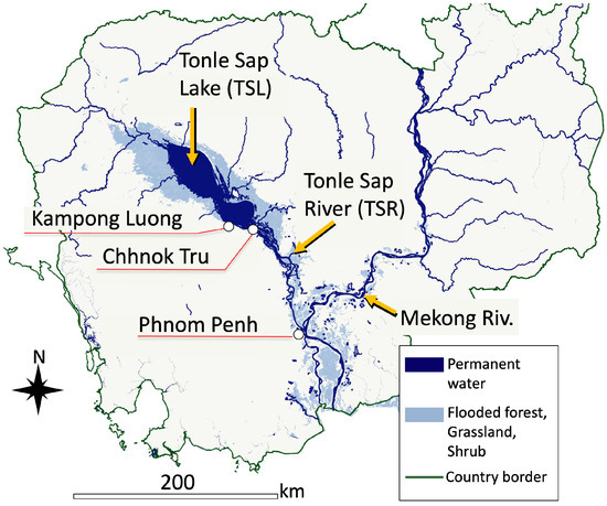 Conversely, during the wet season, the TSL receives a large amount of water from the MR due to reversal flow in the TSR [4]. The maximum flux of the reversal flow reaches approximately 10,000 m/s. This phenomenon causes a significant rise in the TSL’s water level, filling up wide floodplains surrounding the lake. By the end of the wet season, the lake’s depth reaches 10 m, and the water surface area expands sixfold (15,000 km) compared to that of the dry season (2600 km) [2]. Due to the cyclical expansion and shrinking of its water area throughout the year, the TSL is referred to as the “heart of Cambodia”.