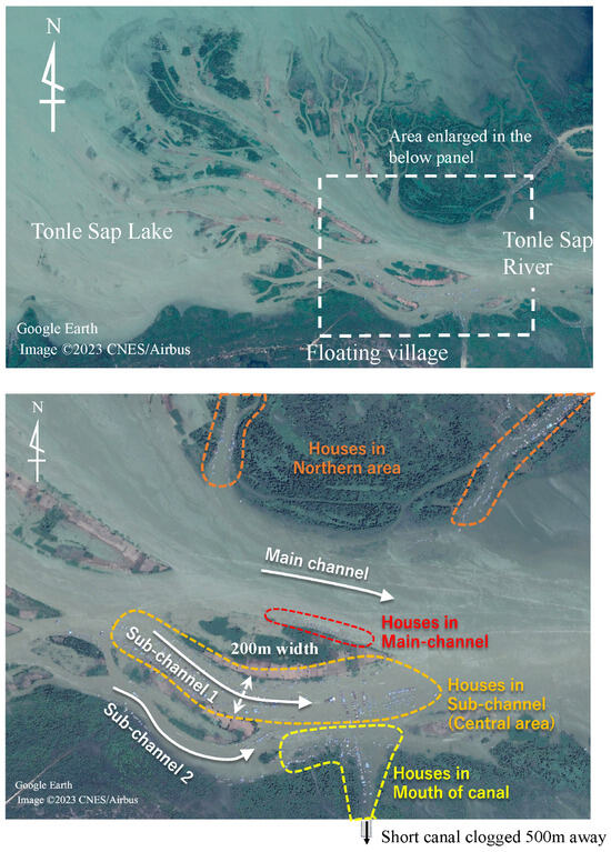 In addition to its function as a detention reservoir for the Mekong Delta area [3], the TSL provides important infrastructure for society and the ecosystem. It provides the largest fishery in Cambodia, accounting for 70% of the protein consumed in the country [5]. The flooded forests, shrubs, grasslands, and agricultural fields in the floodplain provide habitats and food for a wide range of species, including globally threatened species. In addition, the lake provides not only economic infrastructure but also places of residence. More than one million people live in the TSL’s floodplain [6]. To cope with seasonal fluctuations in the water level, a large number of people live in floating houses (Figure 2), with ceramic pots or plastic drums fastened to the bases of the houses. Due to the buoyancy of the pots, the floating houses can continue to float on the water surface even as the water level of the lake changes. These floating houses cluster together and form communities, with approximately 90 villages in the TSL [7]. Figure 3 displays the Chhnok Tru floating village, which is one of the largest villages in the TSL and the target site of this study. The Chhnok Tru village is located along water channels in the transitional area connecting the TSL and TSR.