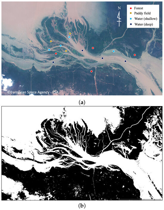 To generate a fine DEM, we used a satellite image provided by the Sentinel-2 Multispectral Instrument (MSI). Figure 4a displays the satellite image in true color, which we employed. The satellite image was recorded in the middle of the dry season (10 March 2018) when the water level decreased to a sufficiently low level to clearly distinguish channels from sandbanks. The Sentinel-2 MSI measures electromagnetic reflectance on the land surface, ranging from visible to infrared wavelengths. Because water absorbs near-infrared light to a larger extent than visible green light, the water content on the land surface can be detected by evaluating the difference in reflectance between visible green and near-infrared light. The normalized difference water index (NDWI) [24,25] is an index based on this concept that is sensitive to water content on the land surface: