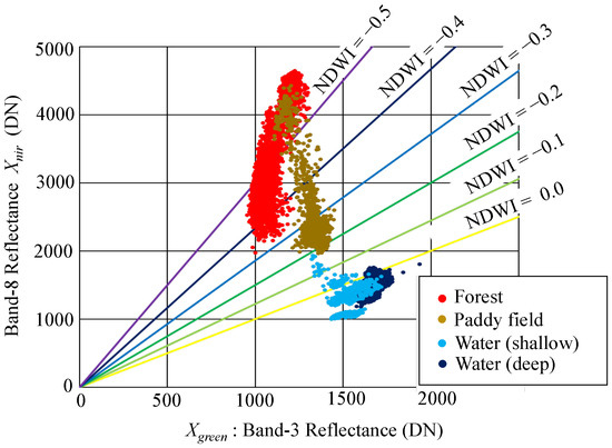 Figure 5 presents a scatter plot of the reflectance values at locations that can be clearly distinguished as either land surface or water surface in the true color image (Figure 4a). In the plot, different values of NDWI are represented as straight lines with different slopes. The NDWI values range from –1 to 1, with a higher value indicating a larger presence of water on the land surface. Dry surfaces, such as forests and paddy fields, are associated with lower NDWI values. Based on the scatter plot, we set as the threshold value. Meshes with NDWI values higher than this threshold were considered to represent the water surface of channels. Figure 4b presents the detected water channels. A dendritic network of many small channels upstream of the Chhnok Tru village is clearly detected.
