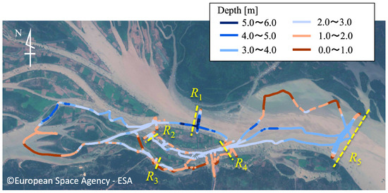 To compensate for the lack of bathymetric data for the small sub-channels where the Chhnok Tru village is located, we conducted a sounding survey on 7 March 2018, three days before the recording of the satellite image used for the NDWI analysis. An acoustic Doppler current profiler (ADCP) unit (River Surveyor M9, SonTek/Xylem) was employed. The ADCP had eight transducers for flow velocity profiling and one vertical transducer for water depth observation. To measure the flow velocity with a measurement error of 1% or 0.2 cm/s, the water depth was measured by irradiating a 0.5 MHz ultrasonic wave vertically downward and recording the reflections. In the survey, the ADCP was installed on the side of a small FRP boat. By driving the boat in a zigzag pattern (Figure 6), spatially dense data were captured across the entire area of the village. In the field observation, in addition to the sounding survey, the flow rate was measured at the five cross-sections indicated by yellow lines in Figure 6. The measured flow rate is presented in Table 1.