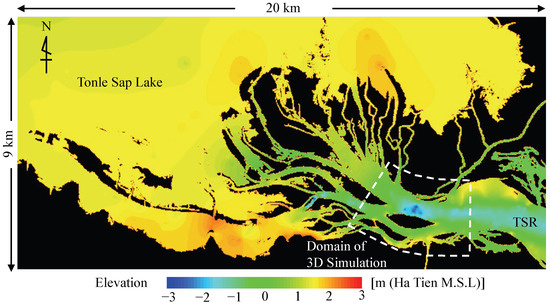As illustrated in Figure 3, the Chhnok Tru floating village is located in the transitional area between the TSL and TSR. The village is located not in the main channel of the TSR but in the southern sub-channels branching off from the TSR. Furthermore, upstream between the village and TSL, the TSR splits into many small channels that create a complex dendritic network of waterways. Under these complex topographic conditions, the availability of accurate topographic data is crucial to achieve realistic flow simulations.