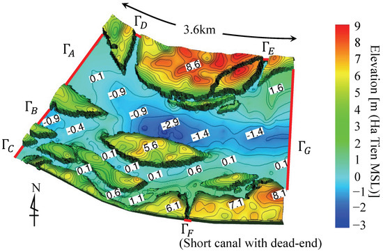 A DEM was created by spatially interpolating the observational results of the sounding survey and the bathymetric data provided by MRC’s map. A rectangular area encompassing the village, measuring 20 km from east to west and 9 km from north to south, was digitized using a uniform Cartesian mesh with a width of 10 m (see Figure 7). To interpolate the bed surface of the channels with a smooth profile, we employed the following biharmonic equation: