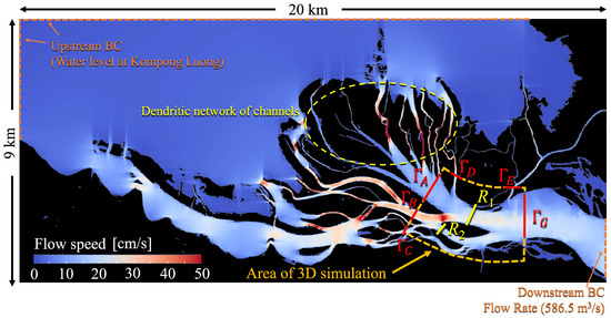 Small channels form the complex dendritic network upstream of the Chhnok Tru village. Water flows from the TSL into the village through the various routes of the network. To simulate the flow in the village, the flow rates of individual small upstream channels were necessary as the boundary condition. However, because information regarding the flow rate was not available, we employed a 2D hydraulic model to estimate the flow rate. The computational domain was set to the entire area of the DEM displayed in Figure 7. Although the domain was wide (20 km × 9 km), encompassing both the village and upstream channel network, a fine mesh size of 10 m was used to represent narrow channels. To address the long computational time caused by the fine mesh, we applied a newly developed 2D model. This model solves the shallow water equation and accelerates the simulation to be 100 times faster than a conventional model through massive parallel computation using the general-purpose computing on graphics processing units (GPGPU) method (see [28] for details). The model has already been applied to the flow simulation in the same water area as this study, while the area is expanded to include the whole TSL and TSR [28]. In that previous work, it had been confirmed that the model has enough performance to effectively restore the seasonal rising/descending of water level in the TSL with accuracy, and the Manning’s roughness coefficient had been optimized, being based on the observational data. We employed the same Manning’s coefficient of in the present work.
