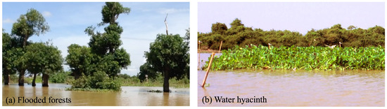 Covering of the water surface by (a) flooded forest and (b) cluster of water hyacinth.