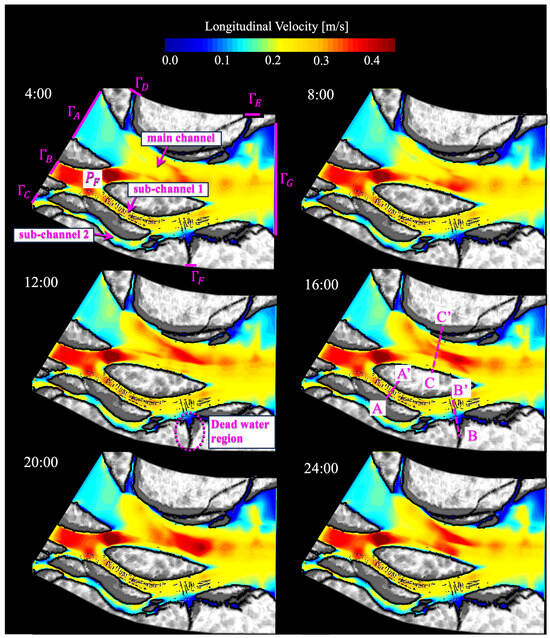 Diurnal change in longitudinal flow velocity calculated by 3D hydraulic simulation on 7 March 2018. The flow velocity is displayed on the water surface, whereas a 3D profile was calculated in the simulation.