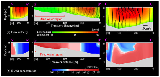 Calculated profile of (a) flow velocity and (b) E. coli concentration in three cross-sections at 16:00 on 7 March 2018. The location of the cross-sections A-A’, B-B’, C-C’ is shown in Figure 11.