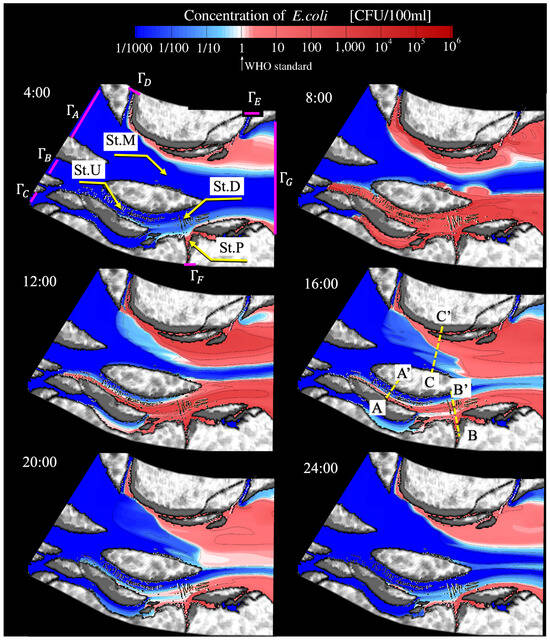 Figure 13 displays the calculated daily change in the concentration of E. coli at the water surface. In the guidelines for drinking water published by the World Health Organization (WHO) [36], it is specified that E. coli should not be detected in a 100 ml water sample. In Figure 13, to illustrate the spatial distribution of contaminated water, an E. coli concentration exceeding the WHO standard ( CFU/100 mL ) is colored in red. The results indicate that the reduction rate of E. coli concentration strongly depends on location due to spatial changes in water flow. As illustrated in Figure 13, in a channel (sub-channel 1 in Figure 3) at the center of the village where many houses are located (denoted St. U in Figure 13), the concentration decreases to meet the WHO standard ( CFU /100 mL) in early afternoon due to relatively rapid water flow. In contrast, in stagnant water areas such as a clogged canal (St. P in Figure 13), the concentration remains 1000 times higher than the WHO standard throughout the day. This variation in reduction rates suggests that the disease risk of pathogenic E. coli can be reduced by selecting appropriate times and locations to withdraw lake water for drinking (e.g., in the evening upstream of a central area where houses are not crowded and the water flow is relatively rapid).
